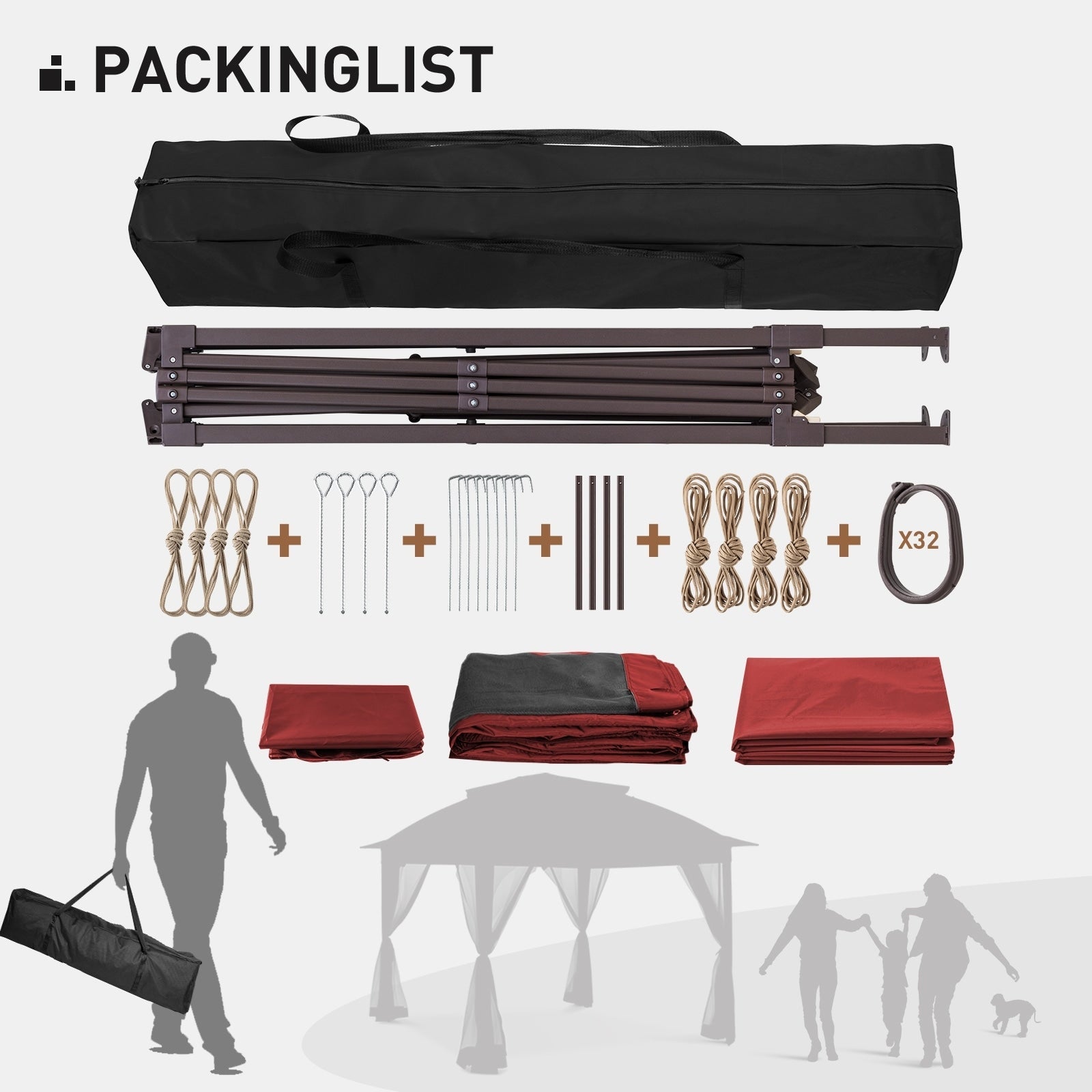 - STURDY FRAME - This pop up gazebo is unexpectedly sturdy though lightweight. The frame is made of high-grade engineered steel and powder coated for rust-resistance. The pop up frame consists several trussbars as connection, they twist together tightly and not easy to be bent or warped. (Stakes and Ropes are included for anchoring purpose)